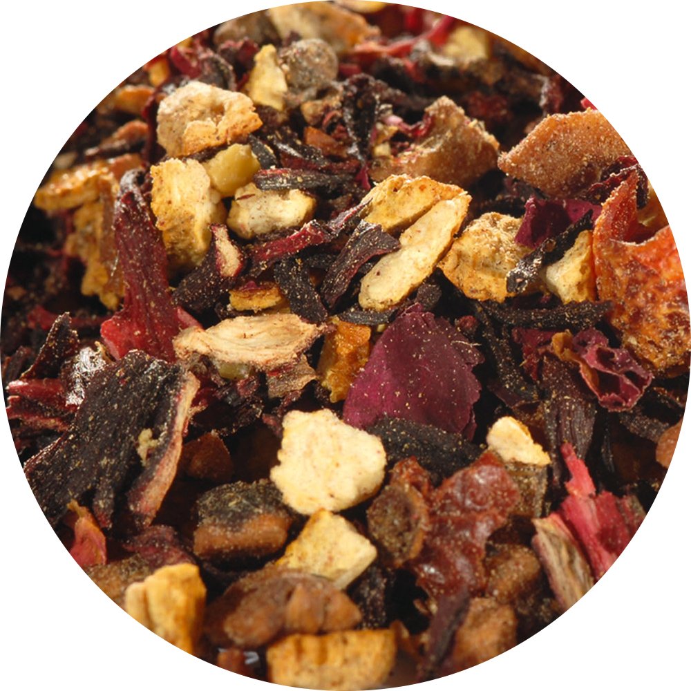 Apfelstücke, Hibiskusblüten, Orangenschalen (10%), Hagebuttenschalen, Rosenblütenblätter, MANDELSTÜCKE, Aroma, Gewürznelken, Kardamompulver, Vanille.