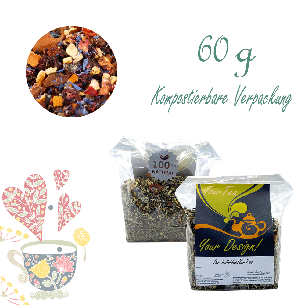 Apfelstücke, Hibiskusblüten, Orangenschalen, Hagebuttenschalen, Pflaumenstücke (8%), Zimtstangen (8%), natürliches Aroma, Kornblumenblüten, Zimtstücke (1%), Aroma, natürliches Nelken-Aroma.