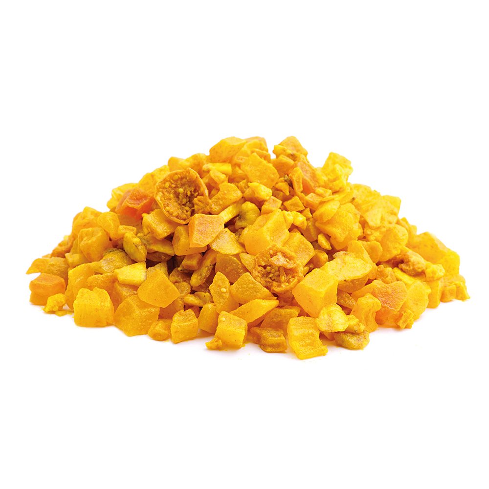 Ananasstücke (20%) (Ananas, Zucker, Säuerungsmittel: Zitronensäure), Melonenstücke (Melone, Zucker, Säuerungsmittel: Zitronensäure), Papayastücke (Papaya, Zucker), Mangostücke (Mango, Zucker, Säuerungsmittel: Zitronensäure), Guavenstücke (Guave, Zucker), Bananenchips (Bananen, Kokosnussöl, Rohrzucker, natürliches Bananenaroma), Aroma, Zitronengranulat (Glukosesirup, Zitronensaftkonzentrat, gezuckerte Aprikosen, modifizierte Stärke, Verdickungsmittel: Natriumalginat, natürliches Aroma), Physalisscheiben (2%), Kurkumapulver.