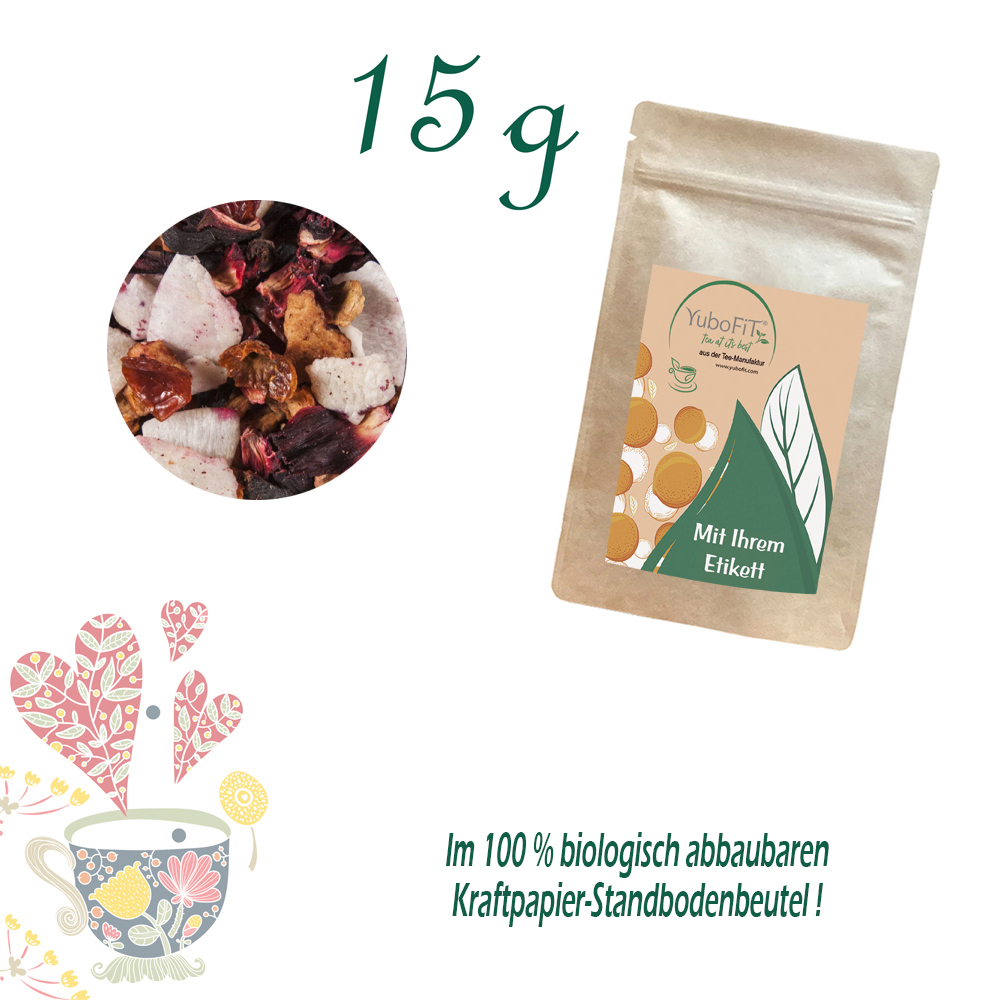 Apfelstücke, Hibiskusblüten, Hagebuttenschalen, Kokosnusschips (12 %), Ananaswürfel (Ananas, Zucker) (8 %), Aromen