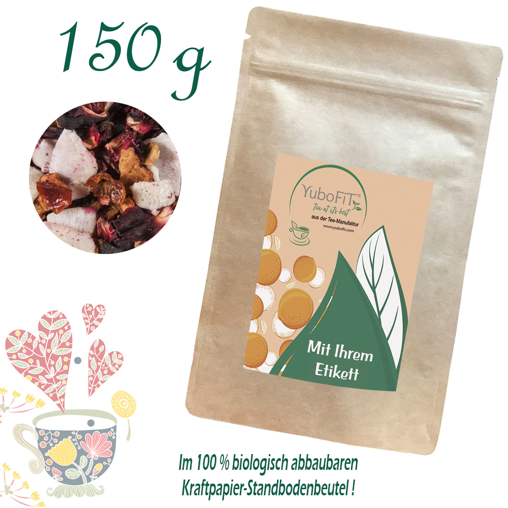 Apfelstücke, Hibiskusblüten, Hagebuttenschalen, Kokosnusschips (12 %), Ananaswürfel (Ananas, Zucker) (8 %), Aromen