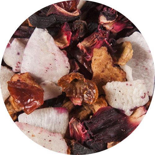 Apfelstücke, Hibiskusblüten, Hagebuttenschalen, Kokosnusschips (12 %), Ananaswürfel (Ananas, Zucker) (8 %), Aromen