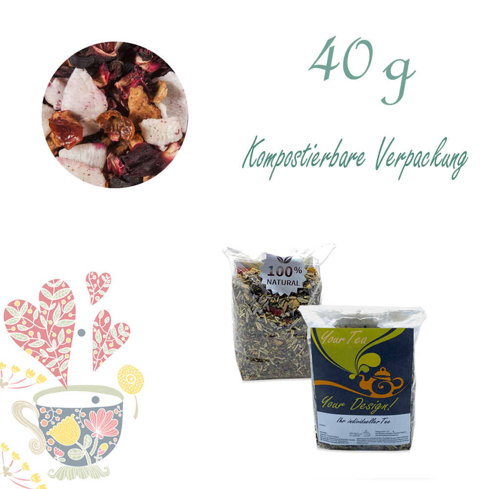 Apfelstücke, Hibiskusblüten, Hagebuttenschalen, Kokosnusschips (12 %), Ananaswürfel (Ananas, Zucker) (8 %), Aromen