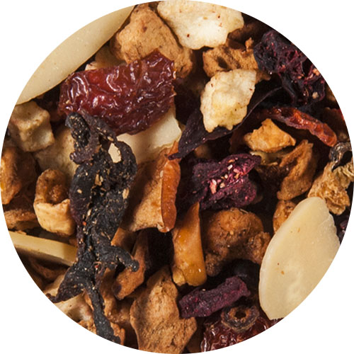 Apfelstücke, Mandeln (20 %), Rote Bete, Zimtstücke, Hagebuttenschalen, Aroma