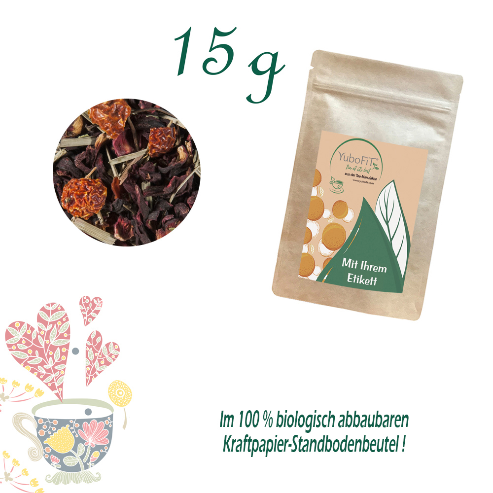 Hibiskusblüten, Hagebuttenkerne, Pfefferminze, Hagebuttenschalen, Zitronengras, süße Brombeerblätter, Brombeerblätter