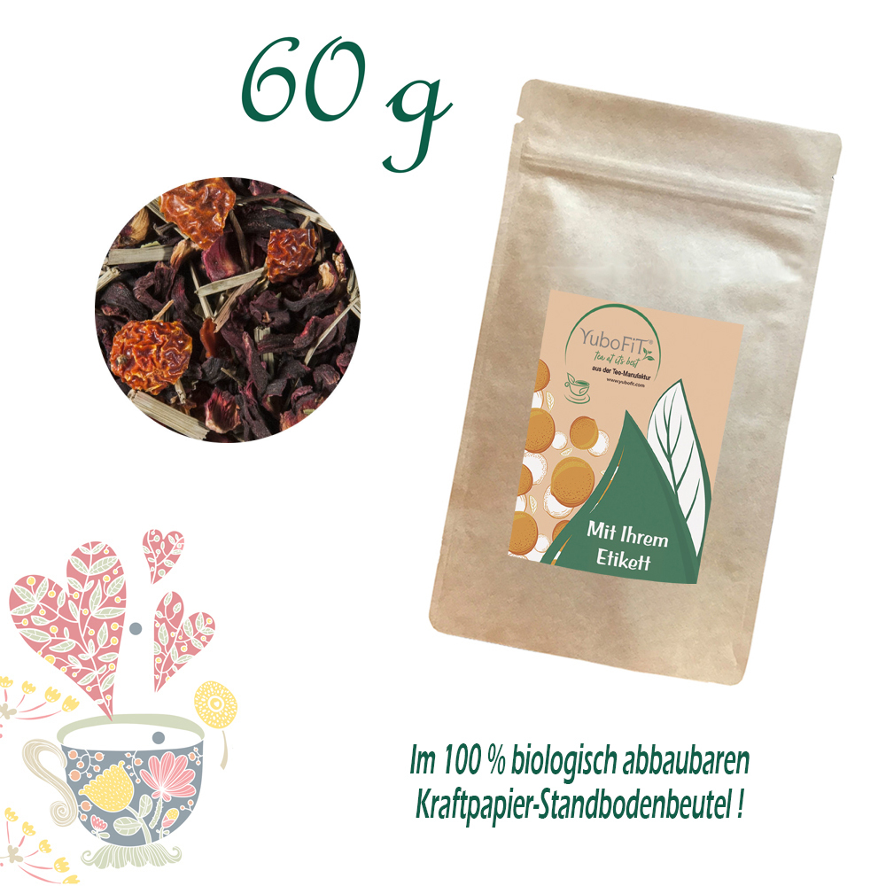 Hibiskusblüten, Hagebuttenkerne, Pfefferminze, Hagebuttenschalen, Zitronengras, süße Brombeerblätter, Brombeerblätter