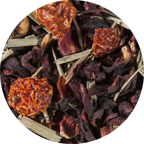 Hibiskusblüten, Hagebuttenkerne, Pfefferminze, Hagebuttenschalen, Zitronengras, süße Brombeerblätter, Brombeerblätter