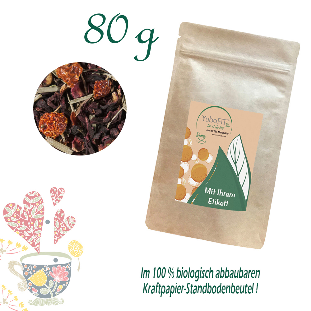 Hibiskusblüten, Hagebuttenkerne, Pfefferminze, Hagebuttenschalen, Zitronengras, süße Brombeerblätter, Brombeerblätter