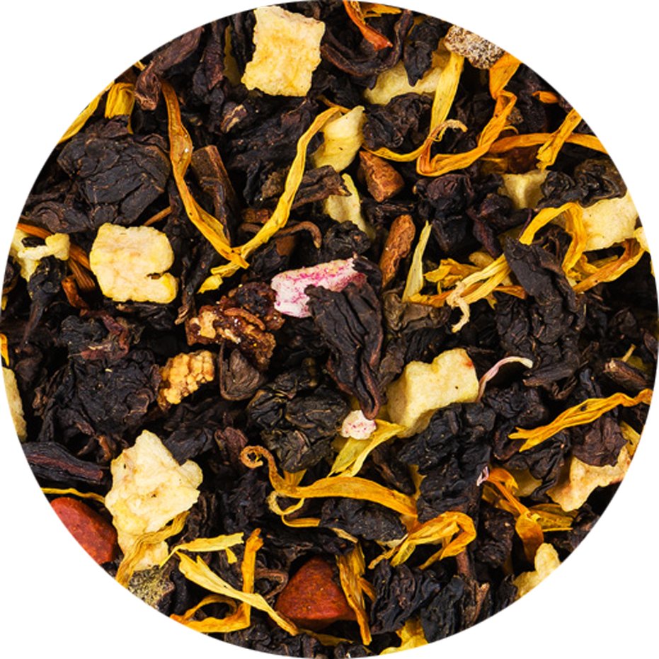 Oolong Tee, Apfel, Zimt, Pflaumenstückchen (Pflaume, Reismehl), Birnenstücke, Kurkuma, Aromen, Ringelblumenblüten