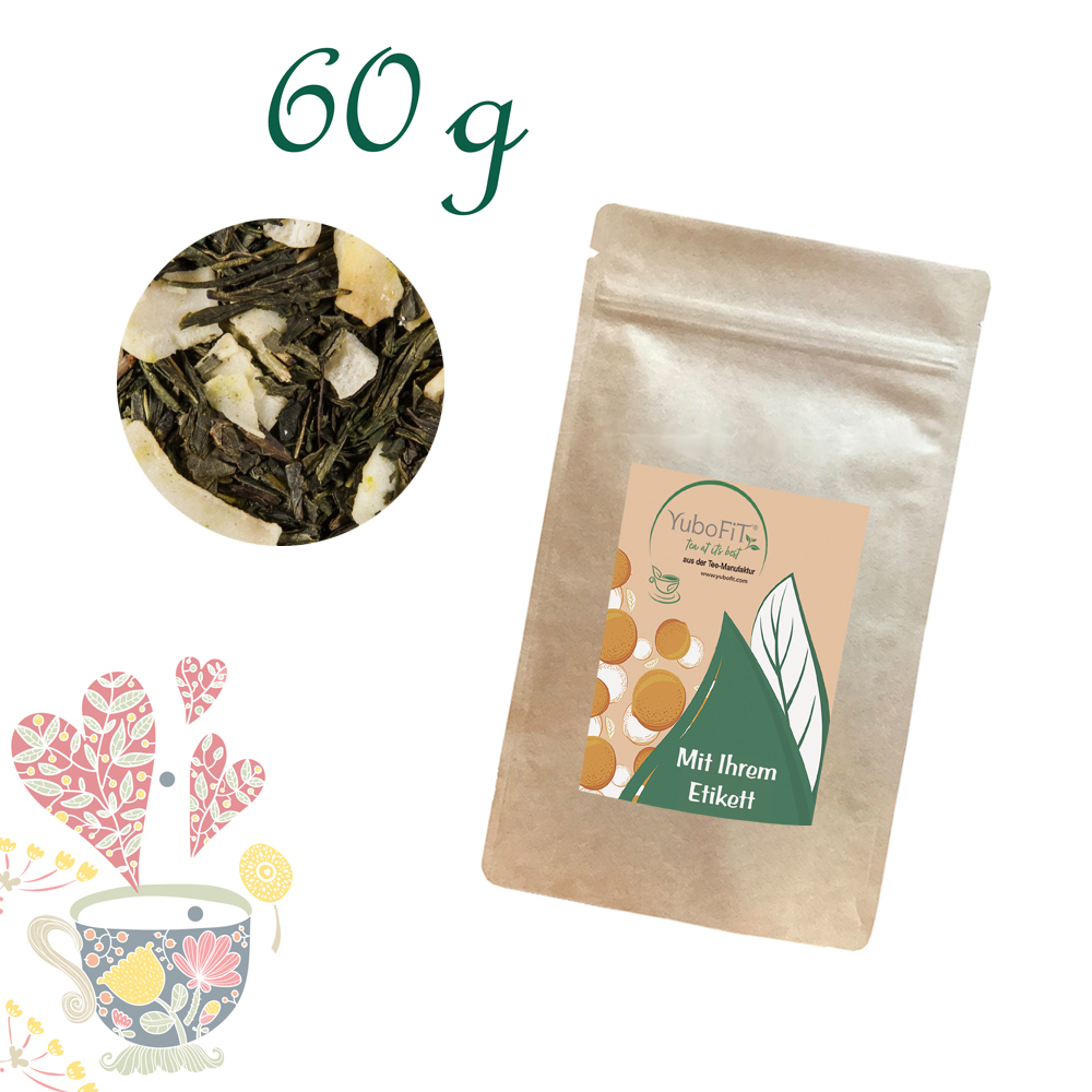 Grüner Tee China Sencha (84 %), Ananaswürfel (Ananas, Zucker) (8 %), Kokosnuss-Chips geröstet (Kokosnuss, Zucker) (6 %), Aromen