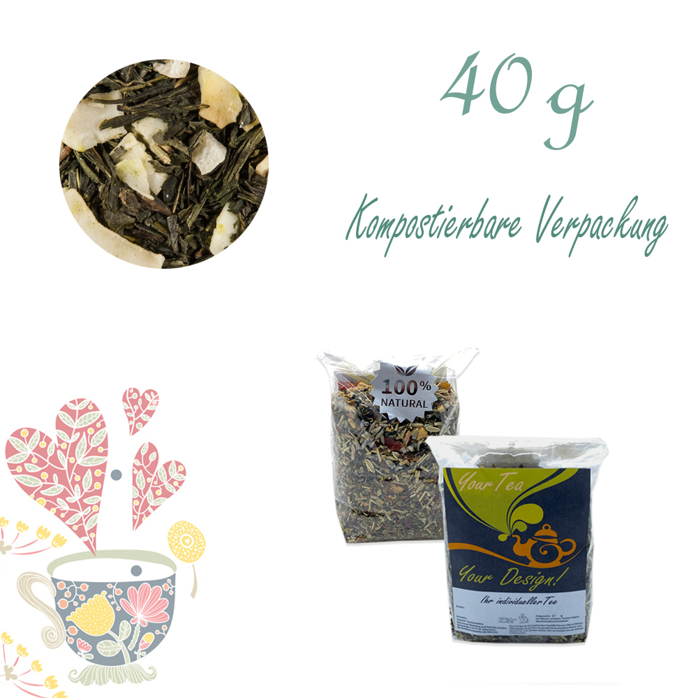 Grüner Tee China Sencha (84 %), Ananaswürfel (Ananas, Zucker) (8 %), Kokosnuss-Chips geröstet (Kokosnuss, Zucker) (6 %), Aromen