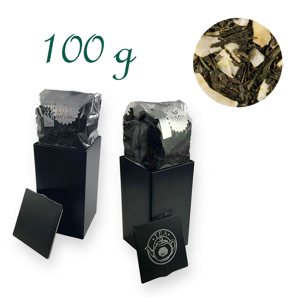 Grüner Tee China Sencha (84 %), Ananaswürfel (Ananas, Zucker) (8 %), Kokosnuss-Chips geröstet (Kokosnuss, Zucker) (6 %), Aromen