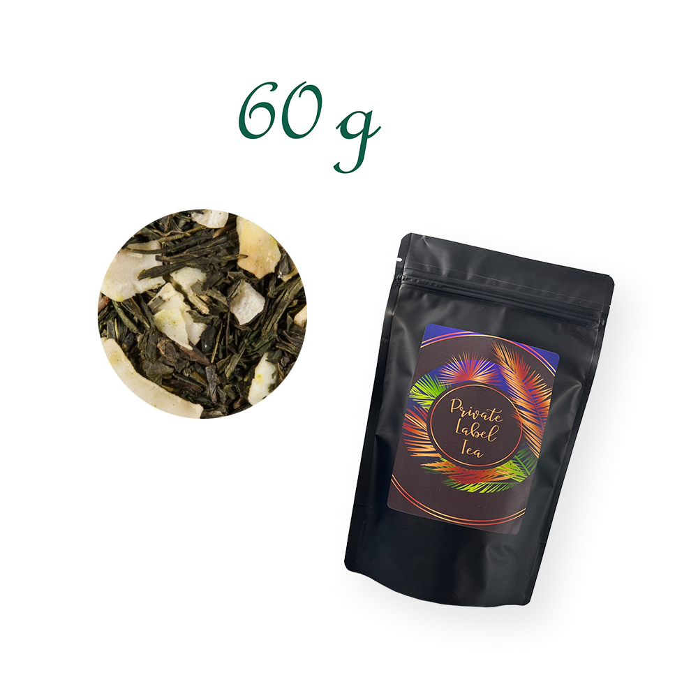 Grüner Tee China Sencha (84 %), Ananaswürfel (Ananas, Zucker) (8 %), Kokosnuss-Chips geröstet (Kokosnuss, Zucker) (6 %), Aromen