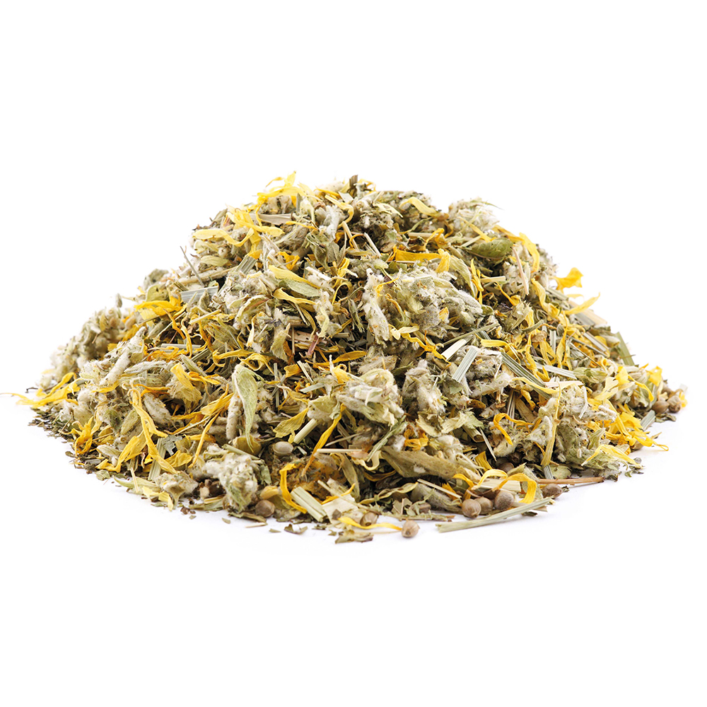 Hanfsamen, Griechischer Bergtee (15%), Krauseminze (15%), Pfefferminze (14%), Zitronengras, Zitronenverbene, Ringelblumenblüten, Pfirsichstücke (1%) (Pfirsiche, Zucker), natürliches Aroma.