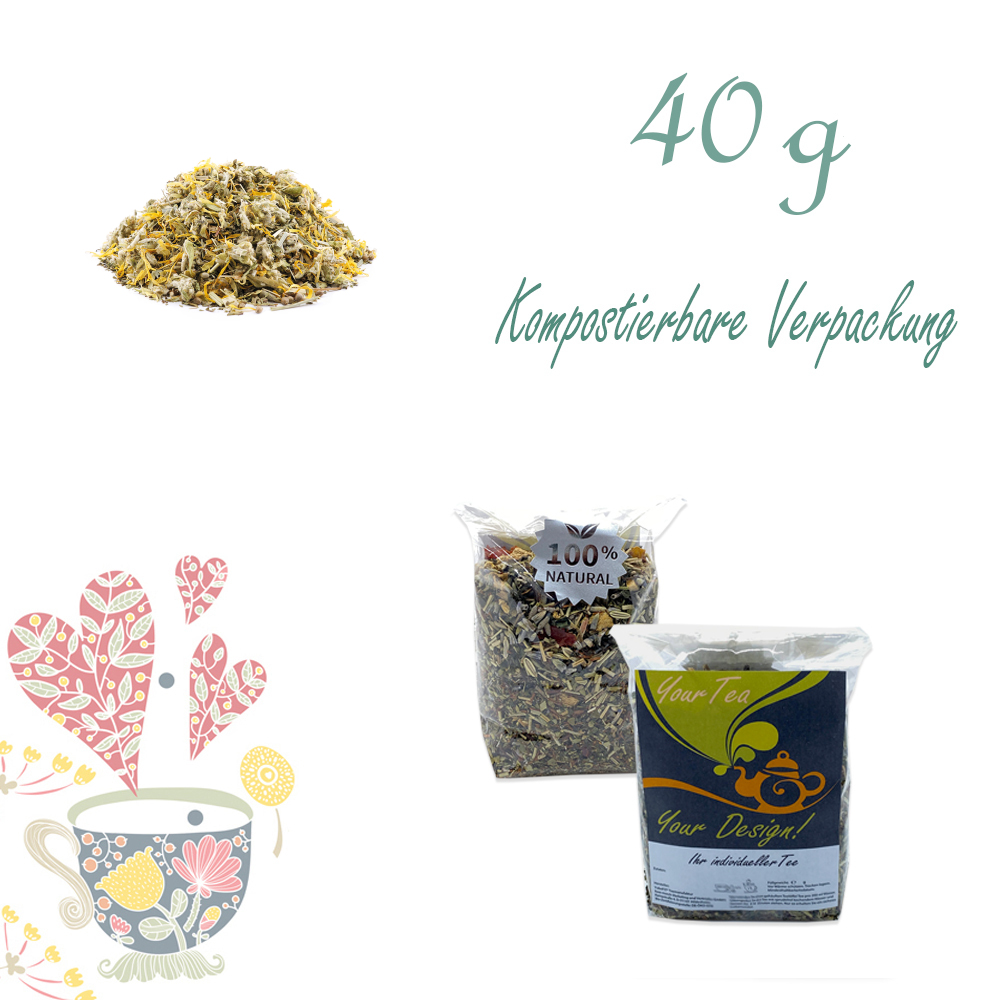 Hanfsamen, Griechischer Bergtee (15%), Krauseminze (15%), Pfefferminze (14%), Zitronengras, Zitronenverbene, Ringelblumenblüten, Pfirsichstücke (1%) (Pfirsiche, Zucker), natürliches Aroma.