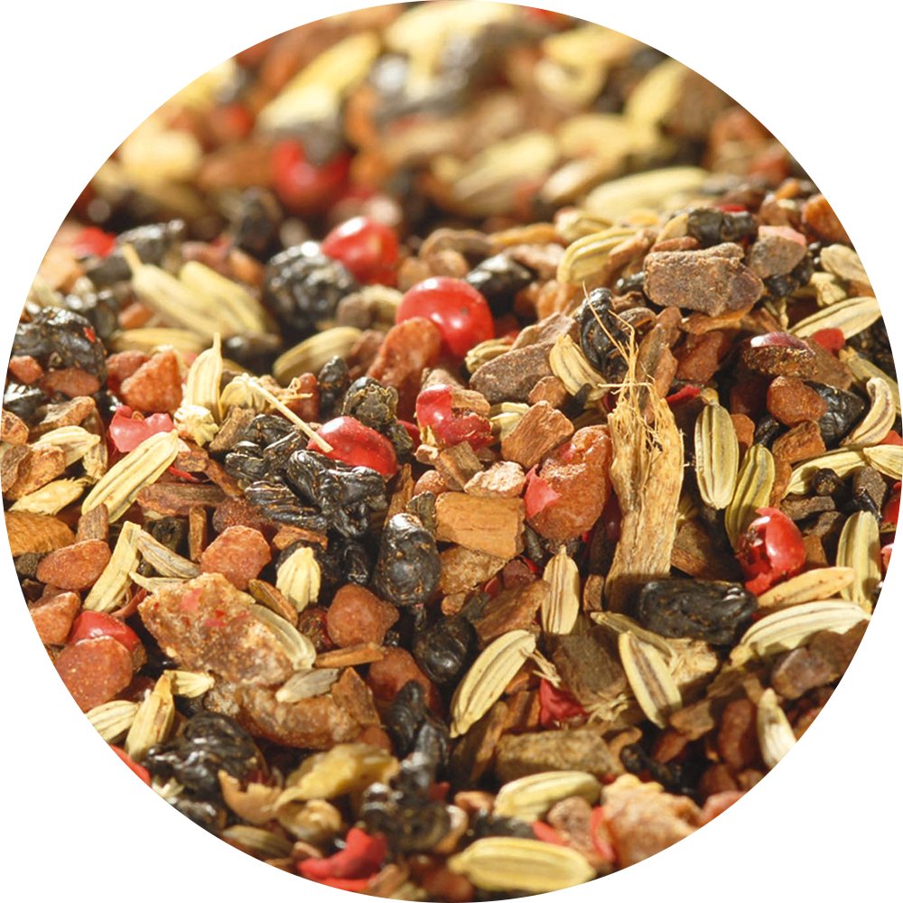 Grüner Tee (21%), Zimtzucker (20%) (Zucker, Karamellzucker, Glukosesirup, Zimt), Zimtstücke (20%), Rosa Pfeffer, Fenchel, Aprikosenstücke (6%), Gewürznelken, Ingwer, Aroma.