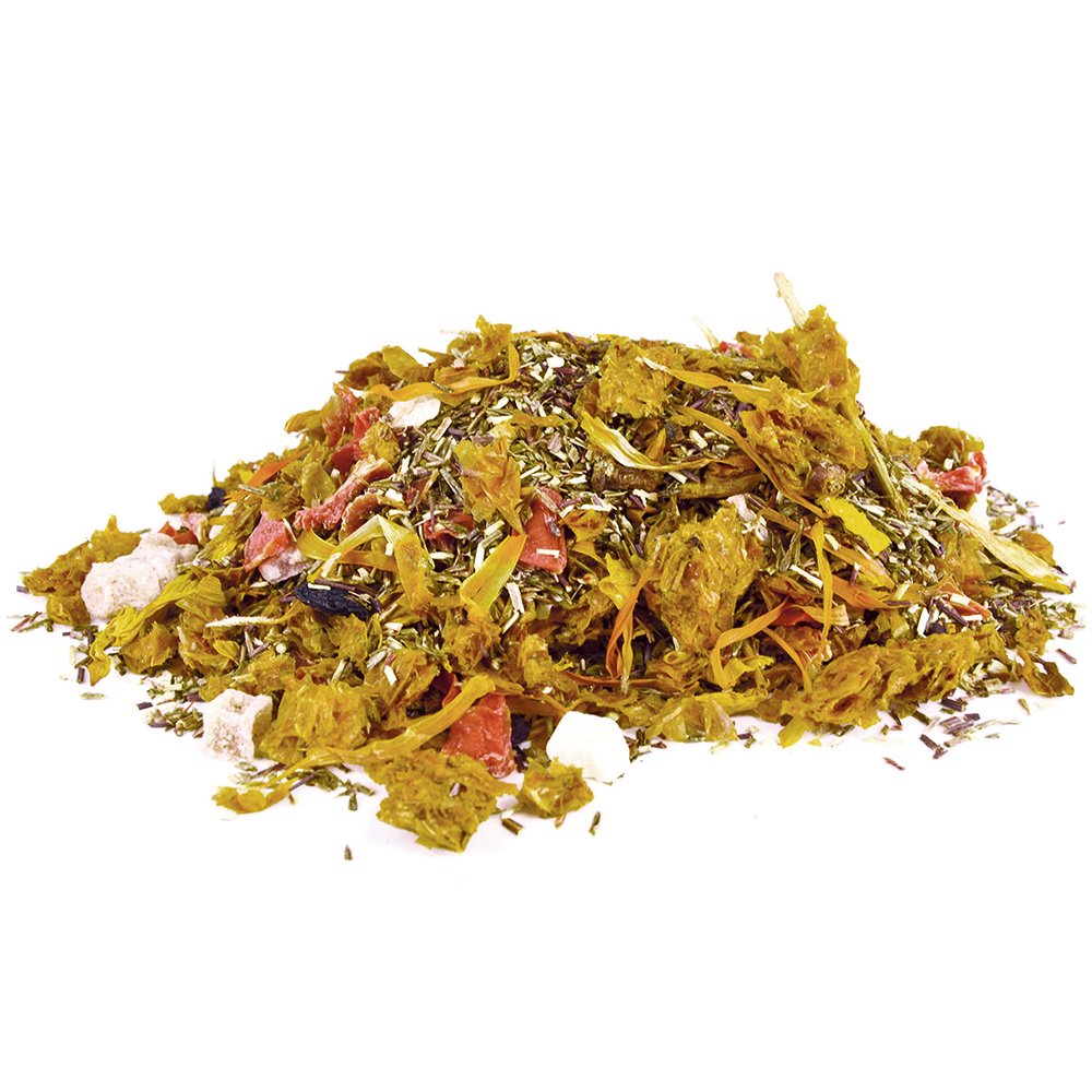 Grüner Rotbuschtee (53%), Sanddornbeerenschalen (20%), Ananasstücke (Ananas, Zucker, Säuerungsmittel: Zitronensäure), Guavenstücke (5%), Karottenstücke, Aroma, Sonnenblumenblüten, natürliches Aroma, Aroniabeerenschalen, Ringelblumenblüten.