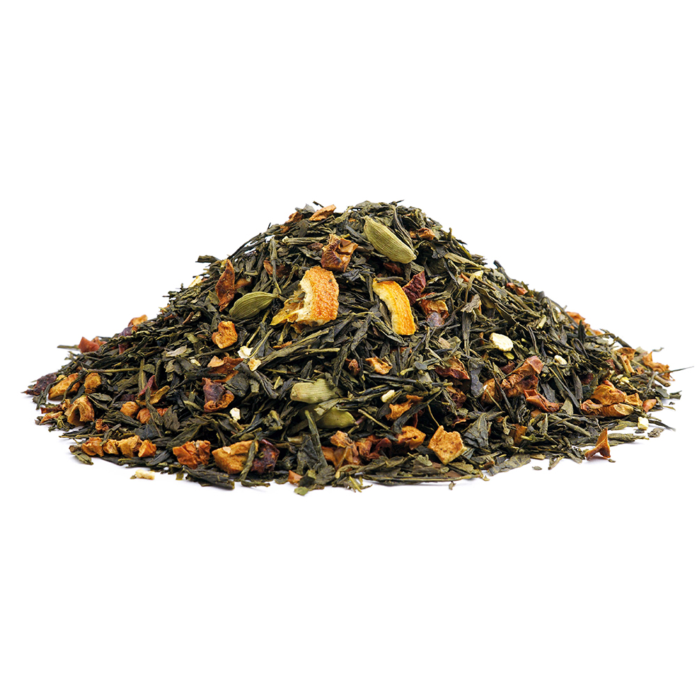 Grüner Tee* (57%), Apfelstücke*, Orangenschalen* (4%), Orangenecken* (4%), Zimtstücke* (4%), natürliches Orangen-Aroma, natürliches Vanille-Aroma, Kardamom*, natürliches Zimt-Aroma. *Aus kontrolliert biologischem Anbau.