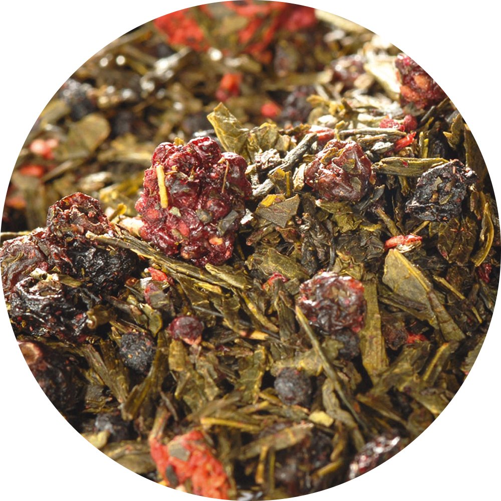 Grüner Tee (52%), Korinthen, Schwarze Johannisbeeren, Aroma, Attichbeeren, Brombeeren, Himbeeren, Erdbeerstücke.