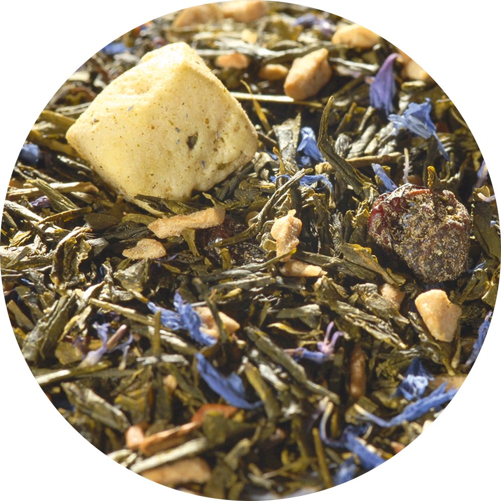 Grüner Tee (71%), gesäuerte Apfelstücke (10%) (Äpfel, Antioxidationsmittel: Ascorbinsäure, Salz, Säuerungsmittel: Zitronensäure), Korinthen, Marzipanstücke (5%) (MANDELN, Zucker), Zimtstücke, Aroma, Kornblumenblüten.