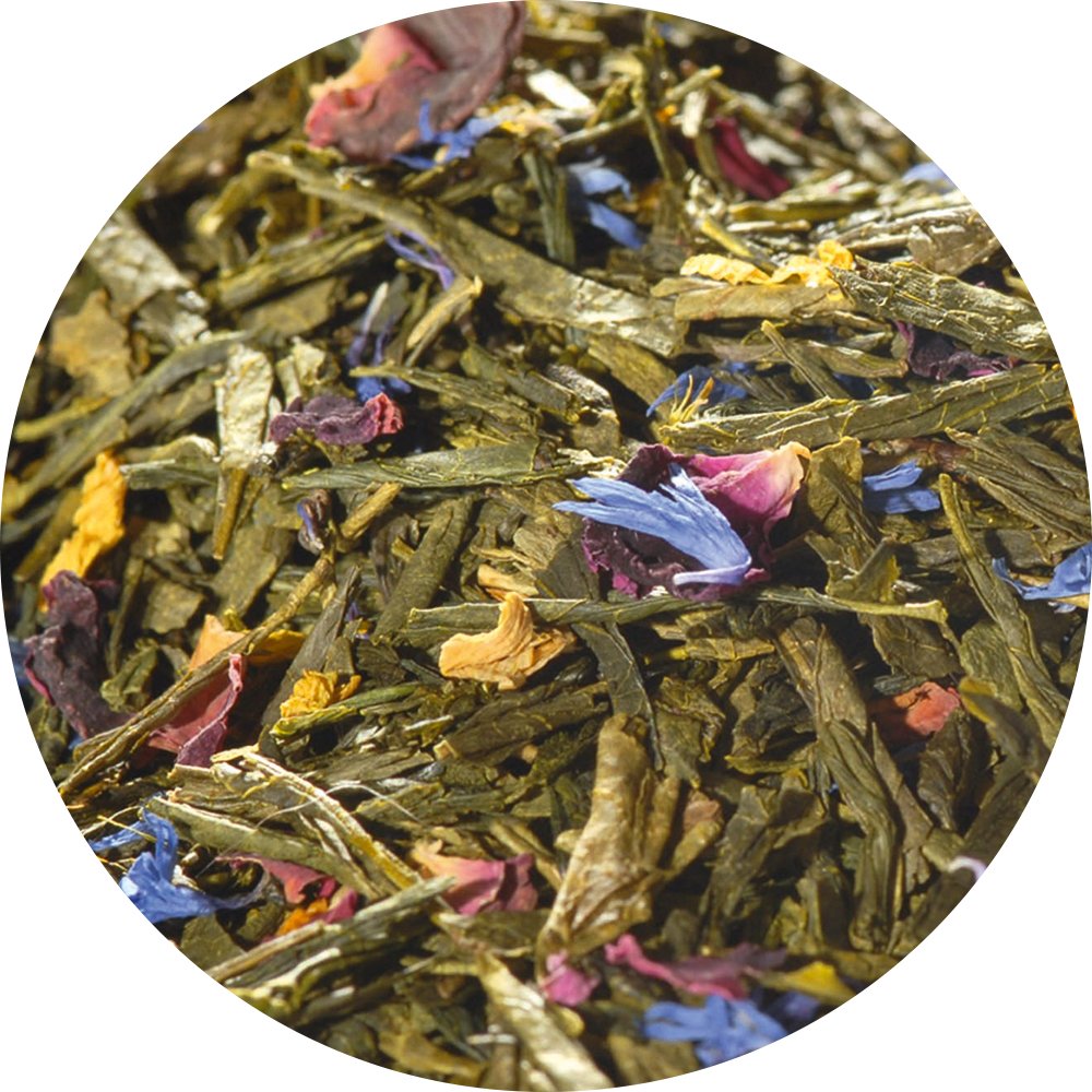 Grüner Tee (92%), Rosenblütenblätter, Sonnenblumenblüten, natürliches Aroma, Kornblumenblüten, Aroma, natürliches Bergamotte-Aroma mit anderen natürlichen Aromen.