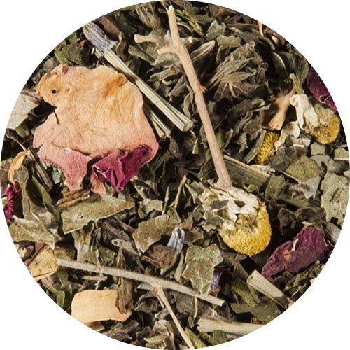 Melisse, Pfefferminze (25 %), Brombeerblätter, Zitronengras, Kamille (8 %), Lavendelblüten, Rosenblütenblätter, Orangenblüten, Heidekrautblüten