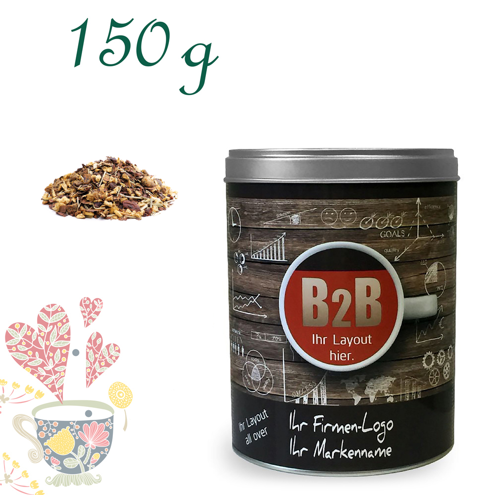 Umverpackt mit Dose aus Weißblech und kompostierbarem Zellglas-Beutel. Geprägtes Siegel aus Zuckerrohrpapier mit biologischem Klebstoff.