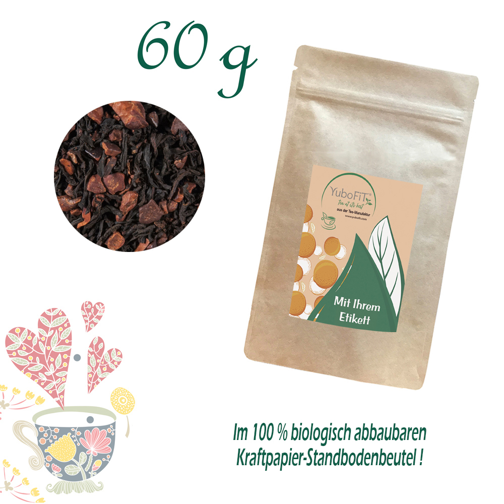 Schwarzer Tee (53 %), gehackte Kakaobohnen (39 %), Schokoladenplättchen (Zucker, Kakaobestandteile, Emulgator: Sojalecithin) (5 %), AromenKann Spuren von Milch enthalten.