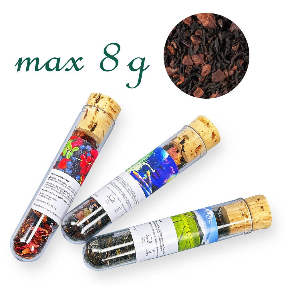 Schwarzer Tee (53 %), gehackte Kakaobohnen (39 %), Schokoladenplättchen (Zucker, Kakaobestandteile, Emulgator: Sojalecithin) (5 %), AromenKann Spuren von Milch enthalten.
