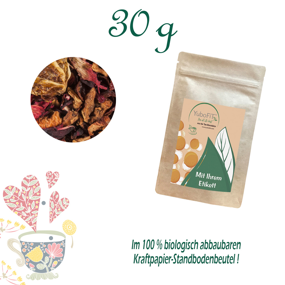 Hibiskusblüten, Hagebuttenschalen, Apfelstücke, Rooibos, Mandelstücke, Orangenfruchtspalten mit Schale, Zimt, Aromen, Vanillestücke