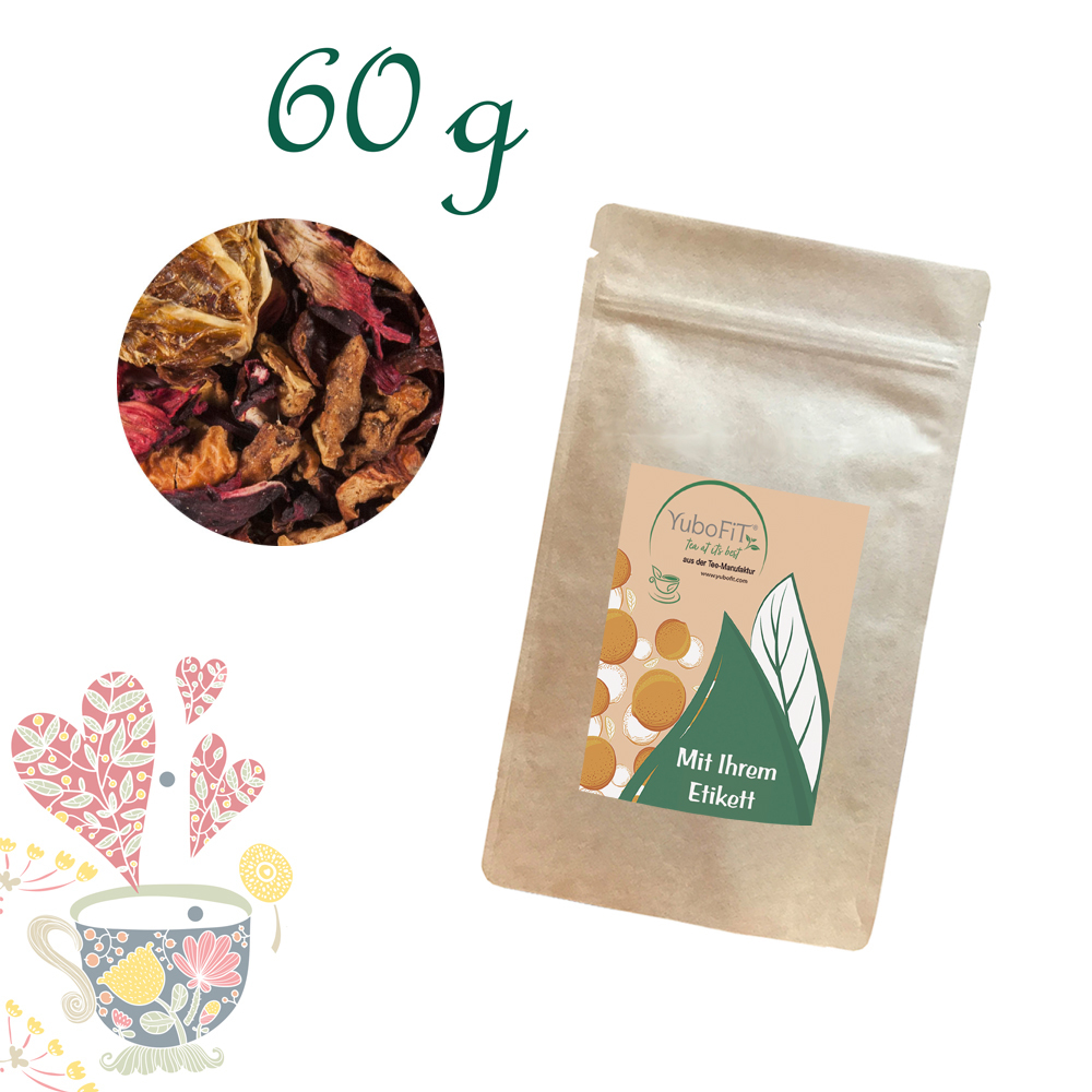 Hibiskusblüten, Hagebuttenschalen, Apfelstücke, Rooibos, Mandelstücke, Orangenfruchtspalten mit Schale, Zimt, Aromen, Vanillestücke