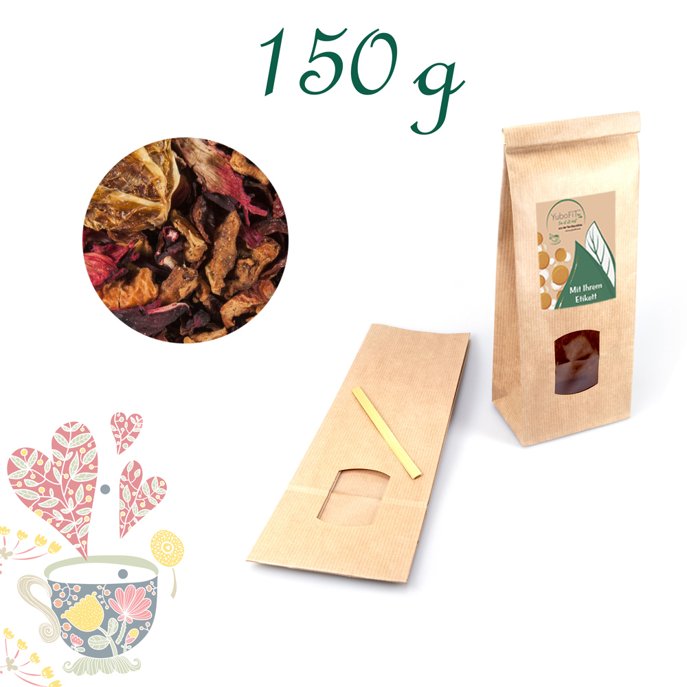 Hibiskusblüten, Hagebuttenschalen, Apfelstücke, Rooibos, Mandelstücke, Orangenfruchtspalten mit Schale, Zimt, Aromen, Vanillestücke