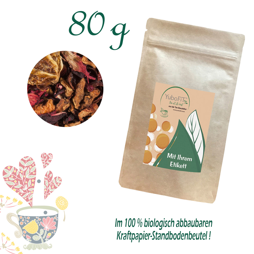 Hibiskusblüten, Hagebuttenschalen, Apfelstücke, Rooibos, Mandelstücke, Orangenfruchtspalten mit Schale, Zimt, Aromen, Vanillestücke