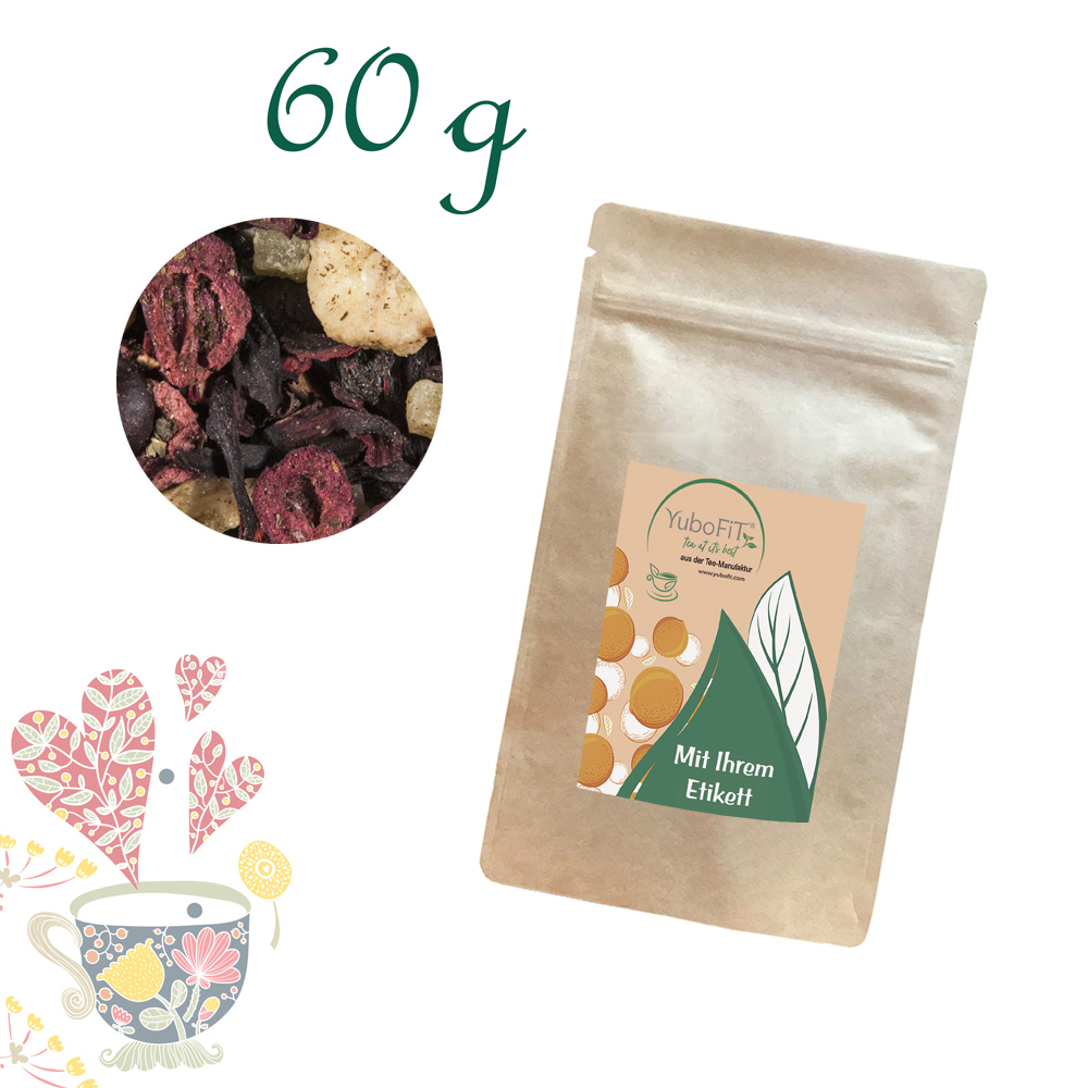 Ananaswürfel (Ananas, Zucker) (30 %), Hibiskusblüten, Bananenchips (Banane, Kokosnussöl, Zucker, Aroma) (17 %), Korinthen, süße Brombeerblätter, Aromen, Sauerkirschen, Cranberryscheiben