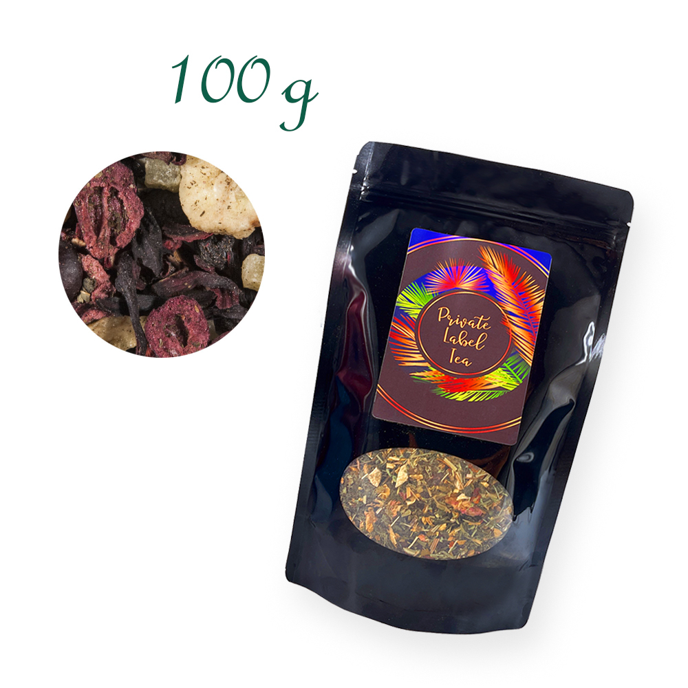 Ananaswürfel (Ananas, Zucker) (30 %), Hibiskusblüten, Bananenchips (Banane, Kokosnussöl, Zucker, Aroma) (17 %), Korinthen, süße Brombeerblätter, Aromen, Sauerkirschen, Cranberryscheiben