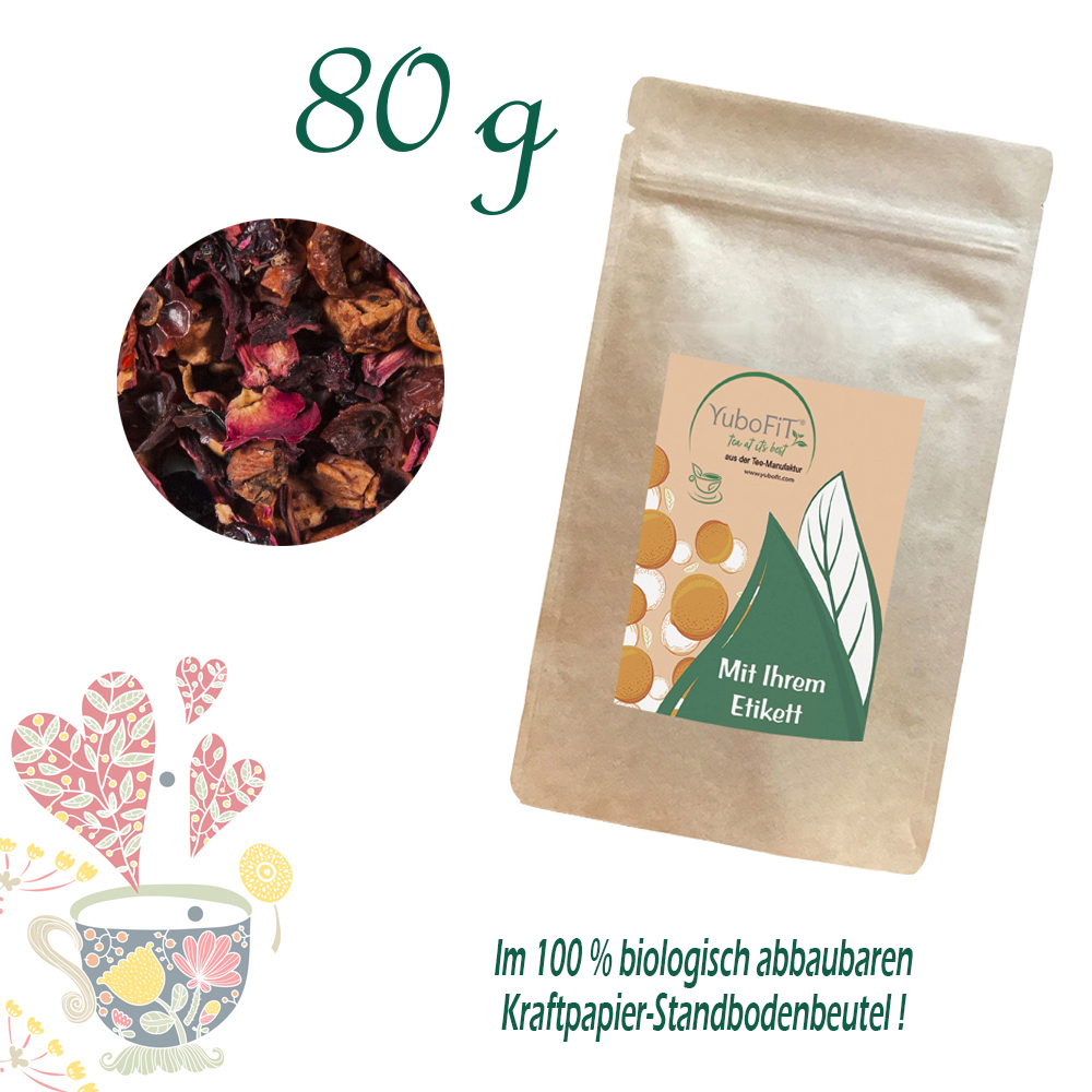 Apfelstücke, Hibiskusblüten, Hagebuttenschalen, Sauerkirschen (7 %), Aromen, Rosenblütenblätter