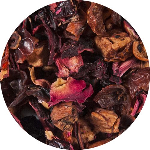 Apfelstücke, Hibiskusblüten, Hagebuttenschalen, Sauerkirschen (7 %), Aromen, Rosenblütenblätter