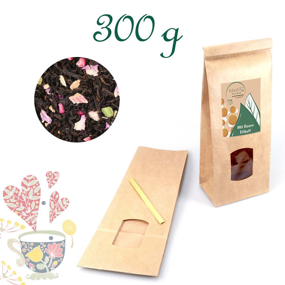 Schwarzer Tee* (89,5 %), natürliche Aromen, Kokosnussraspel*, Rhabarberstücke*, Rosenblütenblätter*, Himbeerstücke* (* Zutaten aus kontrolliert biologischem Anbau)