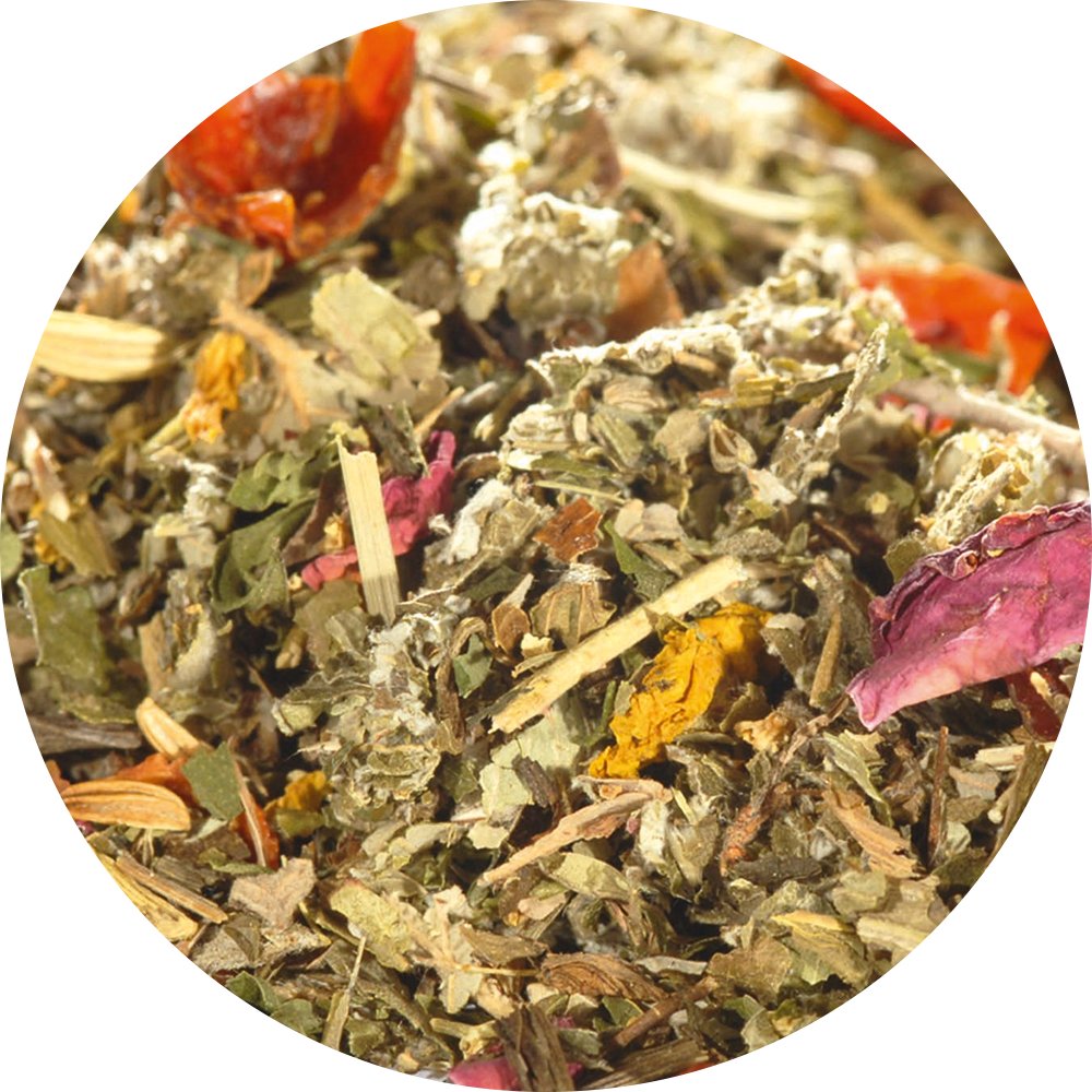 Pfefferminze, Brombeerblätter, Hagebuttenschalen, Apfelstücke, Spitzwegerich, Fenchel, Anis, Holunderblüten, Melisse, Sonnenblumenblüten, Pfingstrosenblüten, Aroma, Wollblumenblüten, Himbeerblätter, Erdbeerblätter.