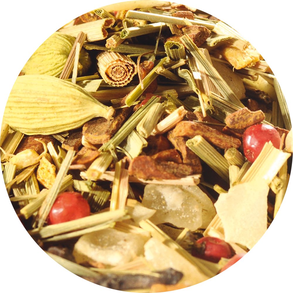 Zimtstücke (35%), Zitronengras, Kokosnusschips, Ananasstücke (Ananas, Zucker, Säuerungsmittel: Zitronensäure), Ingwer, Kardamom, Rosa Pfeffer, Gewürznelken, Schwarzer Pfeffer, natürliches Limetten-Aroma, Aroma.