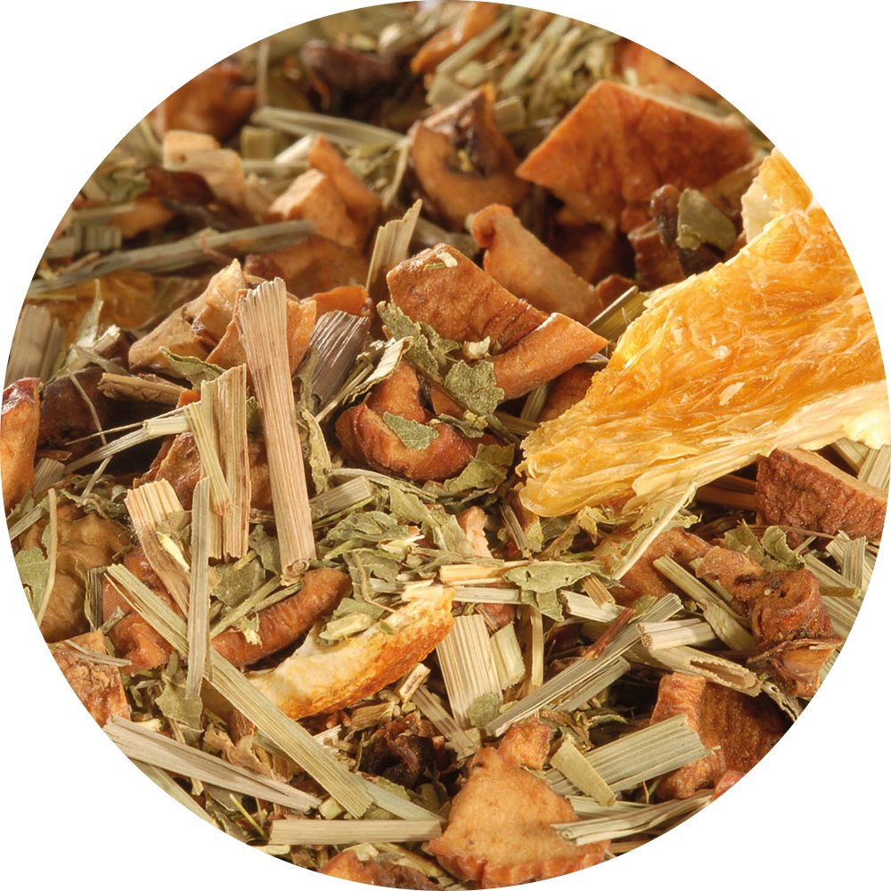Apfelstücke, Grüner Rotbuschtee (11%), Zitronengras (11%), Orangenecken, Zitronenverbene, Aroma, Vanille (1%).