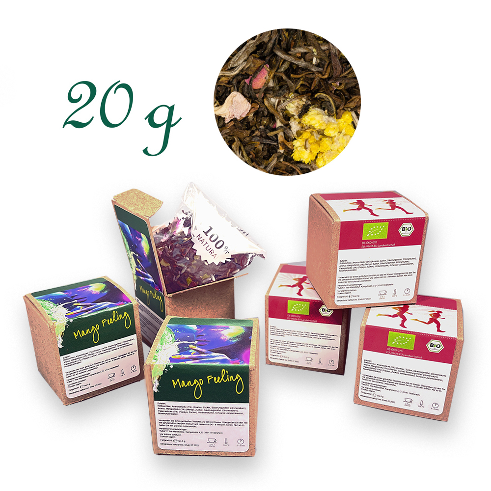 Ein süßlicher, leichter Weißtee-Kuss, der intensiv nach sonnig-reifer Mango schmeckt.