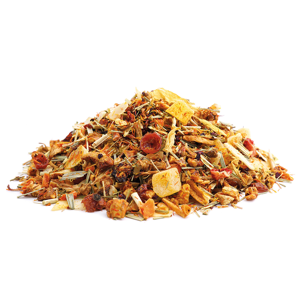 Apfelstücke, Melonenstücke (Melone, Zucker, Säuerungsmittel: Zitronensäure), Kokosnusschips (12%) (Kokosnuss, Zucker), Hagebuttenschalen, Karottenstücke, Zitronengras, natürliches Aroma, weißer Hibiskus, Orangenecken, Saflorblüten, Rote-Bete-Stücke, Multivitaminpulver (Trägerstoff: Maltodextrin, Vitamin C, Nicotinamid, Vitamin E, Panthothensäure, Vitamin B2, Vitamin B6, Vitamin B1, Folsäure, Biotin, Vitamin B12), Sonnenblumenblüten, Erdbeerstücke, natürliches Orangen-Aroma.