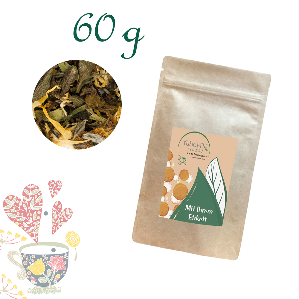 Weißer Tee Pai Mu Tan (73 %), Orangenfruchtspalten mit Schale (15 %), Orangenschale (5 %), Ringelblumenblüten, Aroma