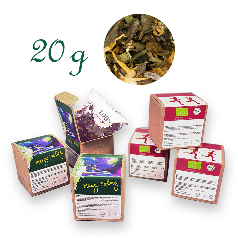 Weißer Tee Pai Mu Tan (73 %), Orangenfruchtspalten mit Schale (15 %), Orangenschale (5 %), Ringelblumenblüten, Aroma