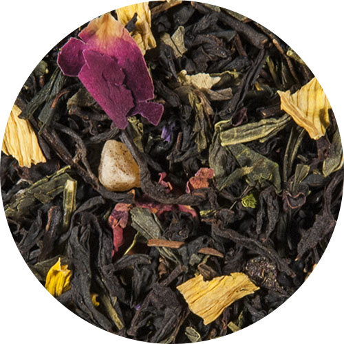 Schwarzer Tee (61 %), Grüner Tee China Sencha (28 %), natürliches Aroma, Papayawürfel (Papaya, Zucker), Korinthen, Sonnenblumenblüten, Rosenblütenblätter, Malvenblüten