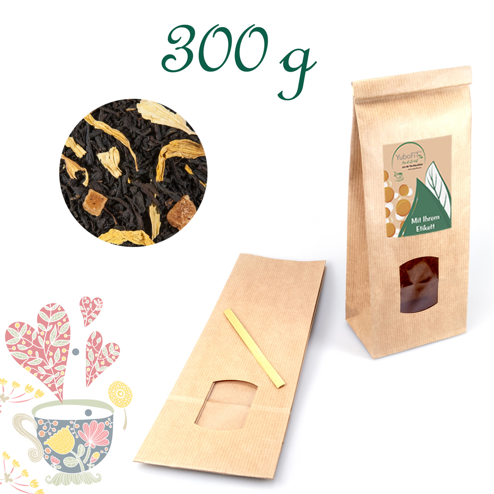 Schwarzer Tee, Papayawürfel (Papaya, Zucker), Aromen, Sonnenblumenblüten, Ananasstücke (Ananas, Zucker)
