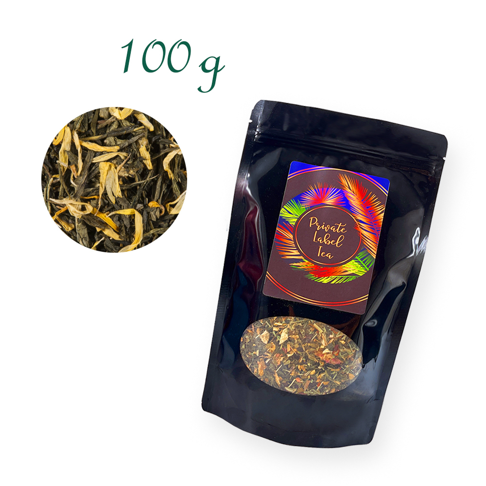 Grüner Tee China Sencha, Aromen, Passionsfruchtgranulat (Glukosesirup, Passionsfruchtsaftkonzentrat, Aprikosenpulpe, modifizierte Stärke, Verdickungsmittel: E401) (3 %), Ringelblumenblüten