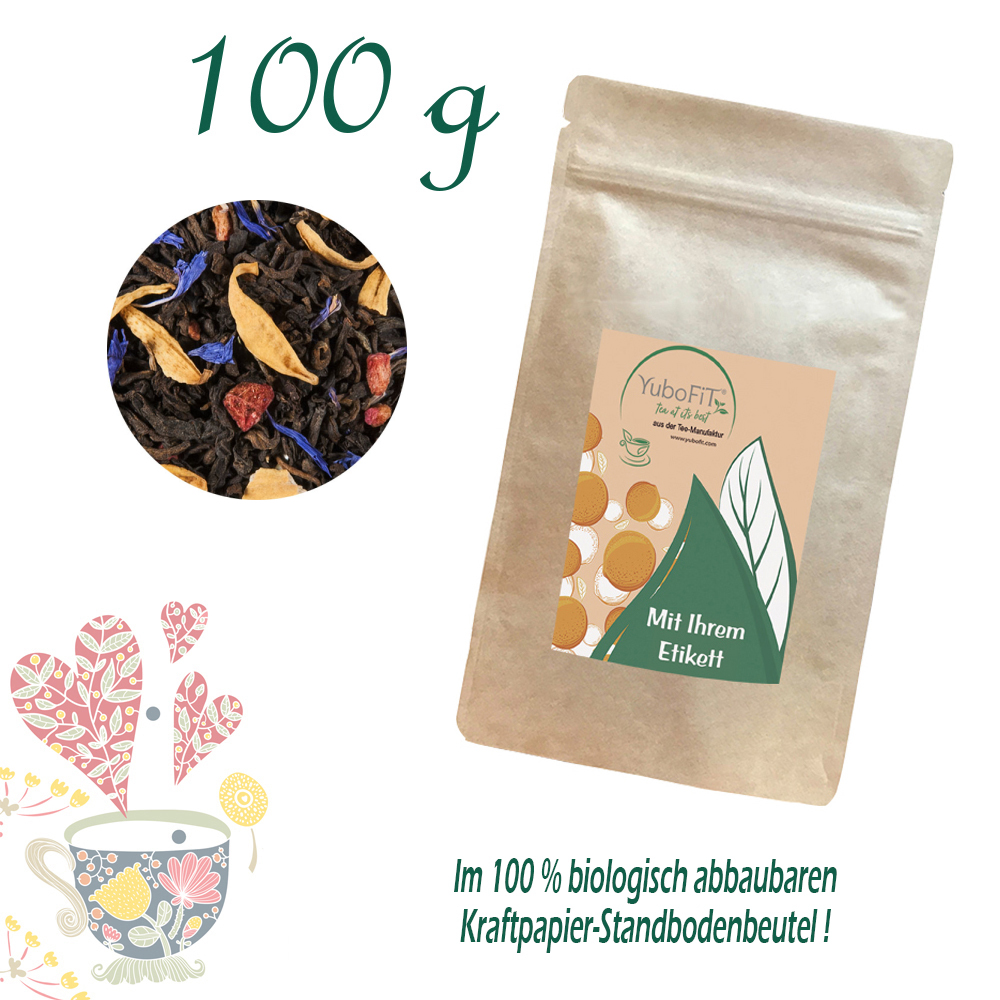 Pu Erh Tee - Tee mit spezieller Fermentation, Orangenblüten, Kornblumenblüten, Himbeerstücke, Aromen