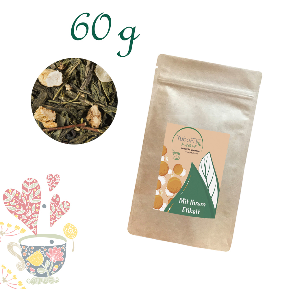 Grüner Tee China Sencha (82 %), Ingwerstücke (5 %), Ananaswürfel (Ananas, Zucker) (5 %), Ginsengwurzel (4,5 %), Aromen